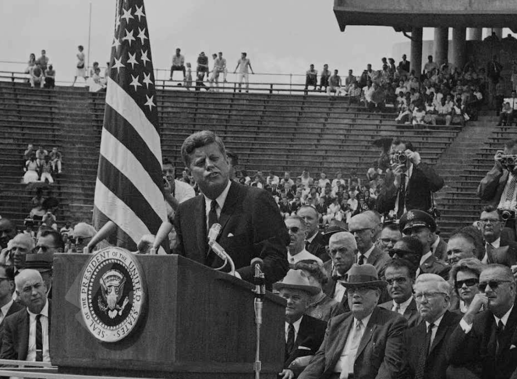 The Space Race of the 1950’s and 1960’s was a key phase of the Cold War as the United States and Soviet Union competed with each other in technological advancement and space exploration. By 1962, the Soviet Union appeared to be in the lead. In 1957, they sent the first satellite, Sputnik into space. In 1959, they made the first spacecraft that reached the surface of the moon. Their biggest triumph occurred in 1961, when Yuri Gagarin became the first man to enter space. With the Soviet Union beating the United States is every major milestone, there were fears that they could win the Space Race. There were also concerns that space could be used as a theatre of war. Whilst speaking as an honorary lecturer at Rice University in Houston, Texas, Kennedy hoped to put the fears of the American people to rest.