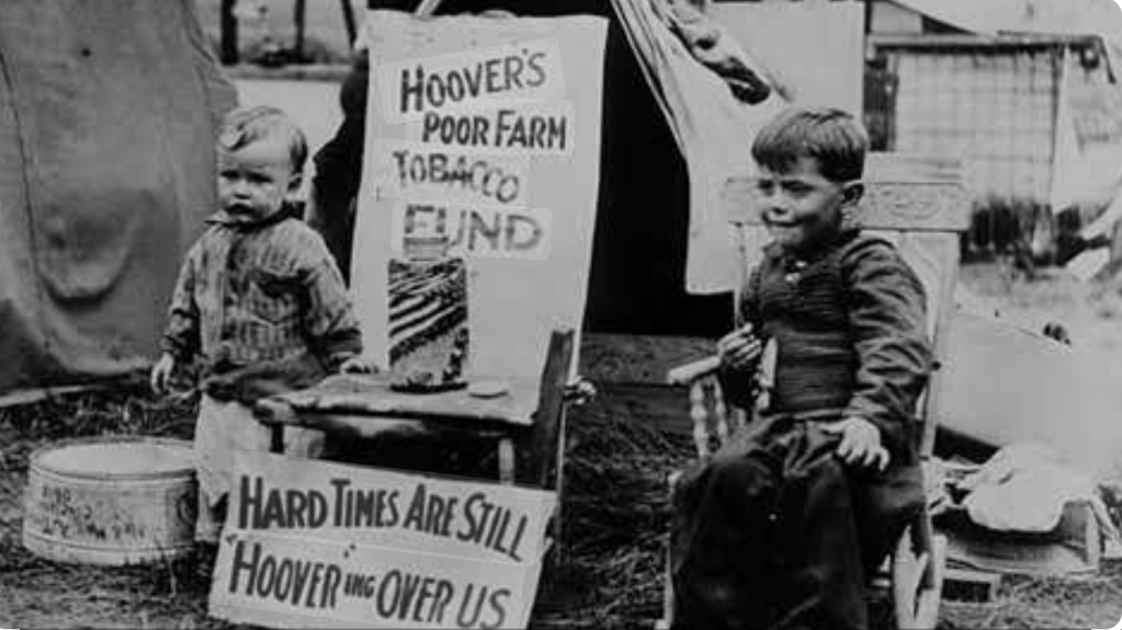 Hoover could not have predicted the events of the 29th October 1929. The stock market crashed overnight and $14 billion in stock value was lost in one day. This became known as ‘Black Tuesday’. The Wall Street Crash led to the Great Depression, which resulted in high unemployment, food shortages, inflation and worsening poverty. Quite the opposite of what Hoover had promised. Hoover was reluctant to act at first. He was a firm believer in ‘rugged individualism’ and believed private charity and the generosity of the wealthy would be enough to solve the growing economic and social issues. Shanty towns began to appear across the US. They became known as ‘Hoovervilles’; this made it clear that many blamed him for what had happened.